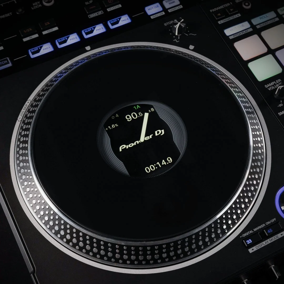 In the center of each jog wheel, a 3.5-inch LCD keeps important information at your fingertips so there’s far less need to switch your gaze between the decks and your laptop. Thanks to an omnidirectional viewing angle, you can see what’s being displayed from any angle, and you can turn off the digital marker that indicates the playback position whenever you want. You can also mark each jog wheel with the included stickers if you prefer this method to the digital marker.