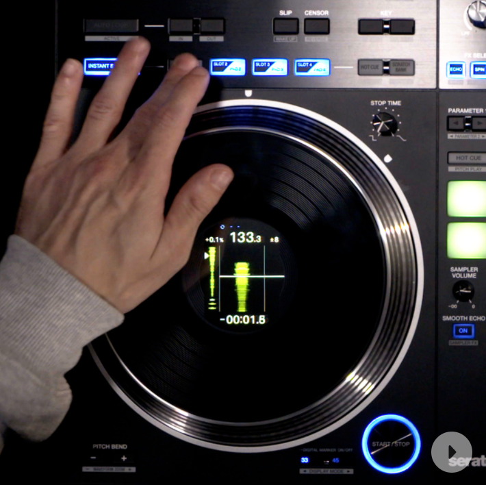 You can also pull the effects levers down and hold them to apply effects from Serato DJ Pro in short bursts, or push them up to lock effects on and free up your hands for scratching or track browsing.